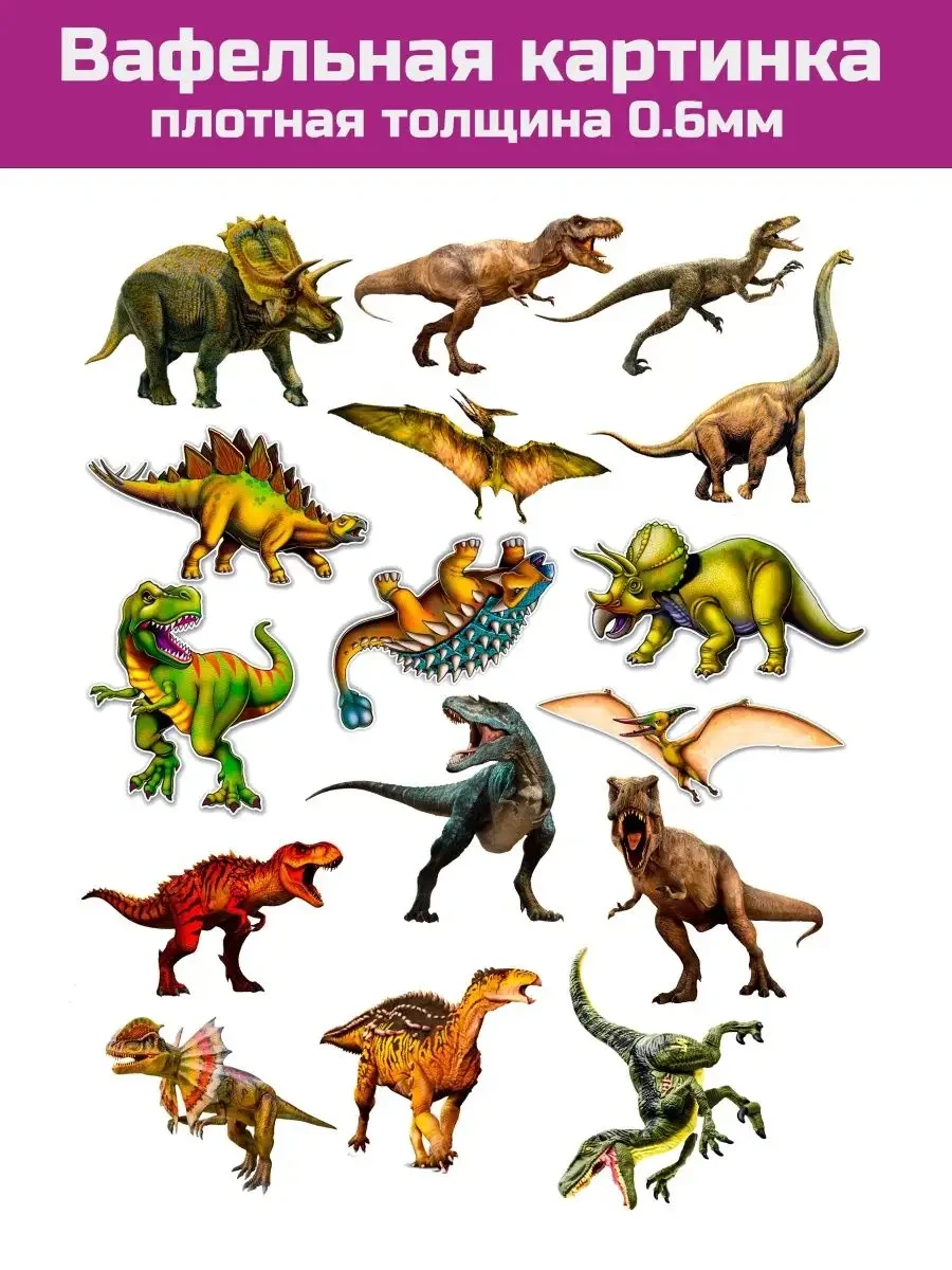 Вафельная картинка динозавров приятно порадует Вашего ребёнка на День рождения. Картинки динозавров можно использовать как топеры, так и на весь торт. Съедобная печать яркая, напечатана пищевыми красителями на плотном вафельном листе с толщиной 0.6мм. Все элементы печати вырезаются ножницами. Рекомендуем:- укладывать картинку на мастику, предварительно смазать слегка водой, что бы образовался липкий слой или смазать картинку кондитерским нейтральным гелем. - укладывать на крем, в котором содержится минимум жидкости, это такие как, белково-заварной крем, на маслянной основе, ганаш или на застывший айсинг. Если картинку уложить на сметанный, сливочный крем, то картинка может размокнуть.Картинки печатаем яркие, в самом высоком разрешении. Вафельная бумага премиум класса. Производитель Германия и Нидерланды.Срок годности картинки 12 месяцев.