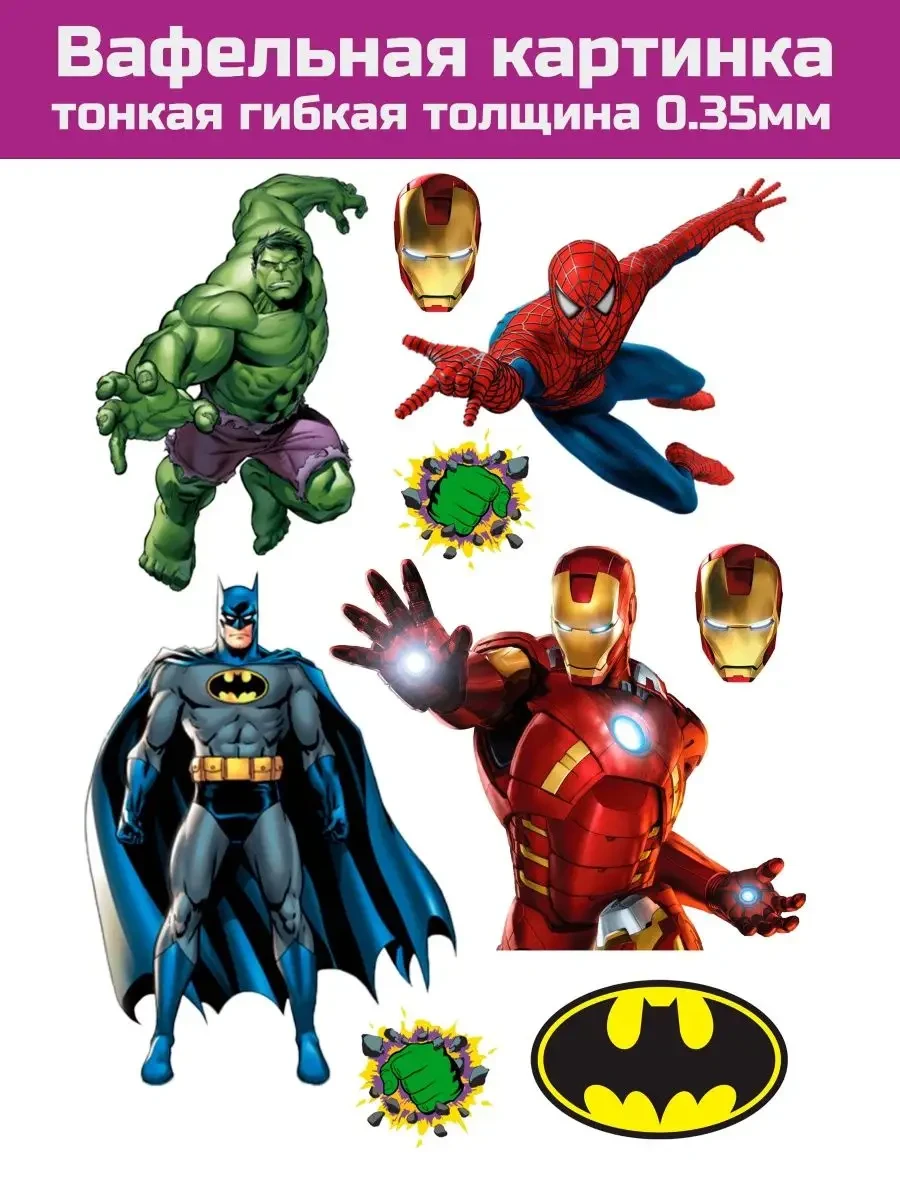 Вафельная картинка супер героев супер мена, халка, железного человека, человека паука, бэтмена и других героев порадует именинника в День рождения. Съедобная печать яркая, напечатана пищевыми красителями на тонком гибком вафельном листе с толщиной 0.35мм. Все элементы печати вырезаются ножницами. Рекомендуем: укладывать картинку на мастику, предварительно смазать слегка водой, что бы образовался липкий слой или смазать картинку кондитерским нейтральным гелем. - укладывать на крем, в котором содержится минимум жидкости, это такие как, белково-заварной крем, на маслянной основе, ганаш или на застывший айсинг. Если картинку уложить на сметанный, сливочный крем, то картинка может размокнуть.Картинки печатаем яркие, в самом высоком разрешении. Вафельная бумага премиум класса. Производитель Германия и Нидерланды. Срок годности картинки 12 месяцев.