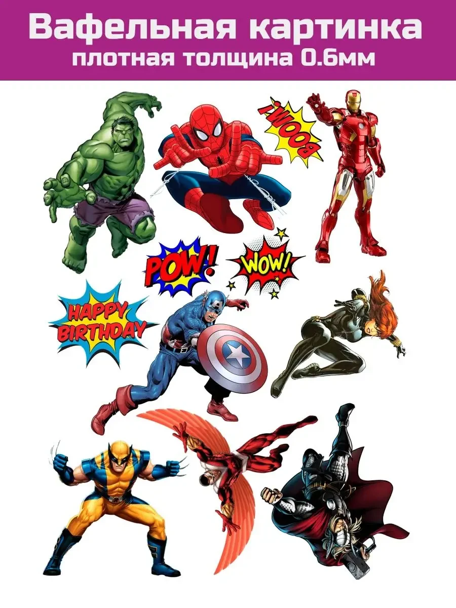 Вафельная картинка супер героев марвел, капитан америка, тора, железного человека, человека паука, стражи галактики и других героев порадует именинника в День рождения. Съедобная печать яркая, напечатана пищевыми красителями на тонком гибком вафельном листе с толщиной 0.35мм. Все элементы печати вырезаются ножницами. Рекомендуем: укладывать картинку на мастику, предварительно смазать слегка водой, что бы образовался липкий слой или смазать картинку кондитерским нейтральным гелем. - укладывать на крем, в котором содержится минимум жидкости, это такие как, белково-заварной крем, на маслянной основе, ганаш или на застывший айсинг. Если картинку уложить на сметанный, сливочный крем, то картинка может размокнуть.Картинки печатаем яркие, в самом высоком разрешении. Вафельная бумага премиум класса. Производитель Германия и Нидерланды. Срок годности картинки 12 месяцев.