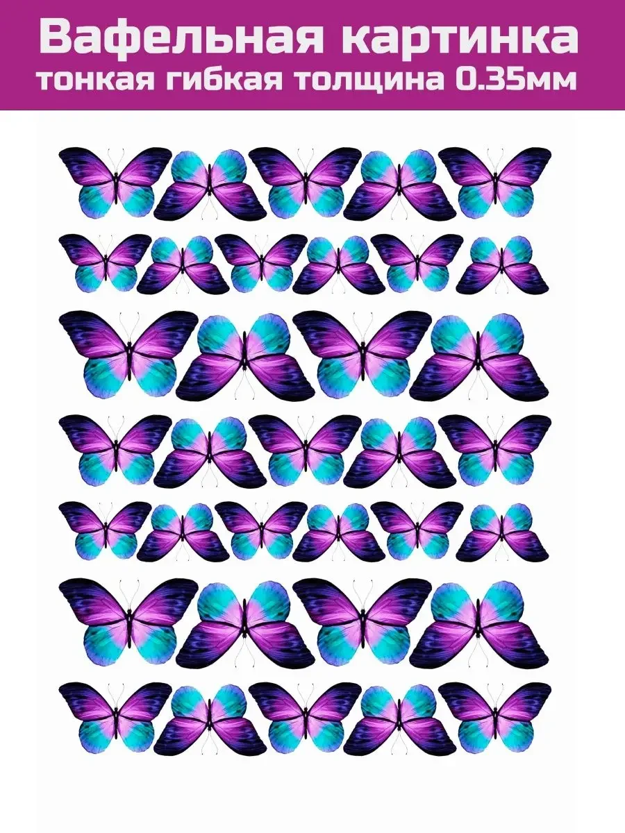Вафельная картинка бабочек украсит любой торт, кекс или маффин. Вафельная картинка не имеет вкуса, поэтому не испортит вкус вашего десерта, торта.Данная картинка напечатана на тонком гибком вафельном листе формата А4 слегка прозрачном. Картинка вырезается ножницами в день или за день до праздника.Вырезанные бабочки хорошо сгибаются слегка предворительно смочив серединку. Рекомендуем укладывать картинку на мастику, предварительно смазать слегка водой, что бы образовался липкий слой или смазать картинку кондитерским нейтральным гелем. Так же вафельную картинку можно укладывать на крем, в котором содержится минимум жидкости, это такие как, белково- заварной крем, на маслянной основе, ганаш или на застывший айсинг. Если картинку уложить на сметанный, сливочный крем, то картинка может размокнуть.Картинки печатаем яркие, в самом высоком разрешенииВафельная бумага премиум класса. Производитель Германия и Нидерланды.Срок годности картинки 12 месяцев.