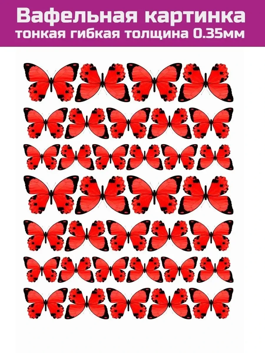 Вафельная картинка бабочек украсит любой торт, кекс или маффин. Вафельная картинка не имеет вкуса, поэтому не испортит вкус вашего десерта, торта.Данная картинка напечатана на тонком гибком вафельном листе формата А4 слегка прозрачном. Картинка вырезается ножницами в день или за день до праздника.Вырезанные бабочки хорошо сгибаются слегка предворительно смочив серединку. Рекомендуем укладывать картинку на мастику, предварительно смазать слегка водой, что бы образовался липкий слой или смазать картинку кондитерским нейтральным гелем. Так же вафельную картинку можно укладывать на крем, в котором содержится минимум жидкости, это такие как, белково- заварной крем, на маслянной основе, ганаш или на застывший айсинг. Если картинку уложить на сметанный, сливочный крем, то картинка может размокнуть.Картинки печатаем яркие, в самом высоком разрешенииВафельная бумага премиум класса. Производитель Германия и Нидерланды.Срок годности картинки 12 месяцев.