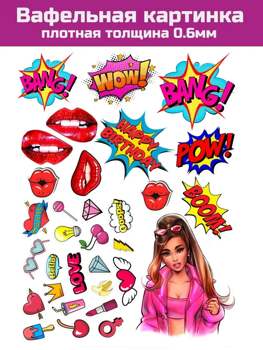 Вафельная картинка для девушки поп арт порадует яркими и красочными элементами украшенными на торте, кексах, это придаст шарм и изюминку празднику. Вафельная картинка плотная с толщиной 0.6мм и напечатана на формате А4. Все элементы вырезаются ножницами.Рекомендуем:- укладывать картинку на мастику, предварительно смазать слегка водой, что бы образовался липкий слой или смазать картинку кондитерским нейтральным гелем. - укладывать на крем, в котором содержится минимум жидкости, это такие как, белково-заварной крем, на маслянной основе, ганаш или на застывший айсинг. Если картинку уложить на сметанный, сливочный крем, то картинка может размокнуть.Картинки печатаем яркие, в самом высоком разрешении. Вафельная бумага премиум класса. Производитель Германия и Нидерланды.Срок годности картинки 12 месяцев.