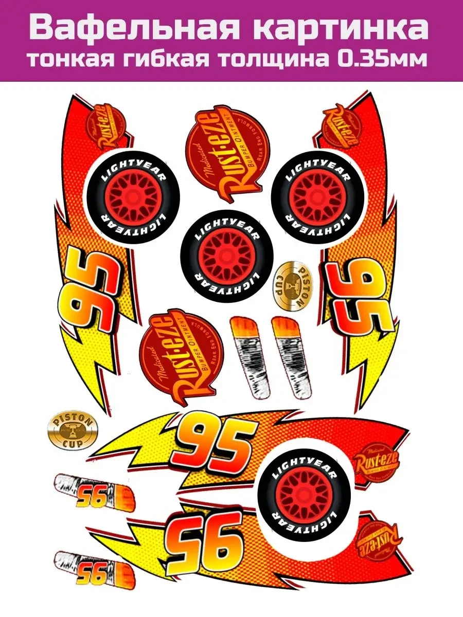 Вафельная печать из известного мультфильма про гонки тачки Маквин (Маккуин) прекрасно подойдёт для поздравления в День рождение вашего ребёнка. Вафельная картинка, топеры персонажей тачек Молния Маккуин, Тодд Маркус, Салли Каррера и многих других вырезаются ножницами и подходят на торт и капкейки. Съедобная печать яркая, напечатана пищевыми красителями на тонком гибком вафельном листе с толщиной 0.35мм. Все элементы печати вырезаются ножницами. Рекомендуем:- укладывать картинку на мастику, предварительно смазать слегка водой, что бы образовался липкий слой или смазать картинку кондитерским нейтральным гелем. - укладывать на крем, в котором содержится минимум жидкости, это такие как, белково-заварной крем, на маслянной основе, ганаш или на застывший айсинг. Если картинку уложить на сметанный, сливочный крем, то картинка может размокнуть.Картинки печатаем яркие, в самом высоком разрешении. Вафельная бумага премиум класса. Производитель Германия и Нидерланды.Срок годности картинки 12 месяцев.