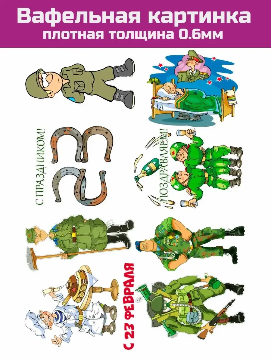 Съедобная печать для торта и кексов в День защитника отечества 23 февраля. Вафельная печать, топеры символики и поздравлений, вырезаются ножницами. Съедобная печать яркая, напечатана пищевыми красителями на плотном вафельном листе с толщиной 0.6мм. Все элементы печати вырезаются ножницами. Рекомендуем:- укладывать картинку на мастику, предварительно смазать слегка водой, что бы образовался липкий слой или смазать картинку кондитерским нейтральным гелем. - укладывать на крем, в котором содержится минимум жидкости, это такие как, белково-заварной крем, на маслянной основе, ганаш или на застывший айсинг. Если картинку уложить на сметанный, сливочный крем, то картинка может размокнуть.Картинки печатаем яркие, в самом высоком разрешении. Вафельная бумага премиум класса. Производитель Германия и Нидерланды.Срок годности картинки 12 месяцев.
