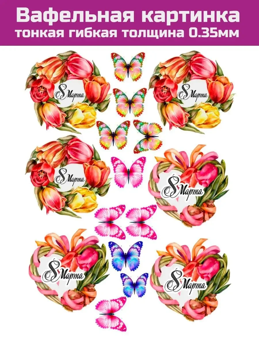 Вафельная картинка для торта и кексов в Всемирный День женщин 8 марта обрадует Вашу маму или любимую девушку. Вафельная печать, топеры символики и поздравлений, вырезаются ножницами. Съедобная печать яркая, напечатана пищевыми красителями на тонком гибком вафельном листе с толщиной 0.35мм. Все элементы печати вырезаются ножницами. Рекомендуем:- укладывать картинку на мастику, предварительно смазать слегка водой, что бы образовался липкий слой или смазать картинку кондитерским нейтральным гелем. - укладывать на крем, в котором содержится минимум жидкости, это такие как, белково-заварной крем, на маслянной основе, ганаш или на застывший айсинг. Если картинку уложить на сметанный, сливочный крем, то картинка может размокнуть.Картинки печатаем яркие, в самом высоком разрешении. Вафельная бумага премиум класса. Производитель Германия и Нидерланды.Срок годности картинки 12 месяцев.