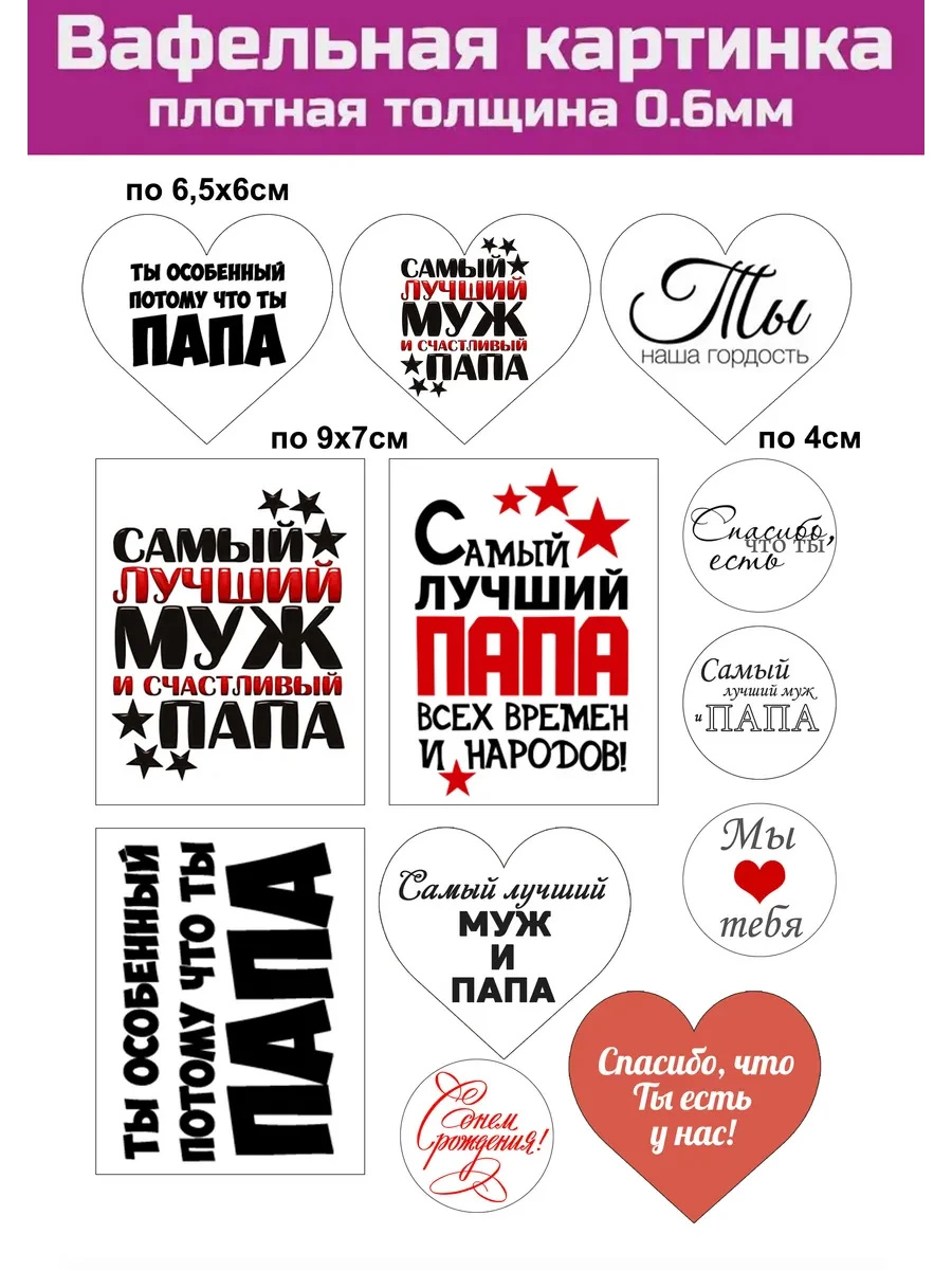 Вафельная печать на торт в день рождения или юбилей приятно удивит ваших близких. Вафельная печать, топеры символики и поздравлений, вырезаются ножницами. Съедобная печать яркая, напечатана пищевыми красителями на плотном вафельном листе с толщиной 0.6мм. Все элементы печати вырезаются ножницами. Рекомендуем:- укладывать картинку на мастику, предварительно смазать слегка водой, что бы образовался липкий слой или смазать картинку кондитерским нейтральным гелем. - укладывать на крем, в котором содержится минимум жидкости, это такие как, белково-заварной крем, на маслянной основе, ганаш или на застывший айсинг. Если картинку уложить на сметанный, сливочный крем, то картинка может размокнуть.Картинки печатаем яркие, в самом высоком разрешении. Вафельная бумага премиум класса. Производитель Германия и Нидерланды.Срок годности картинки 12 месяцев.
