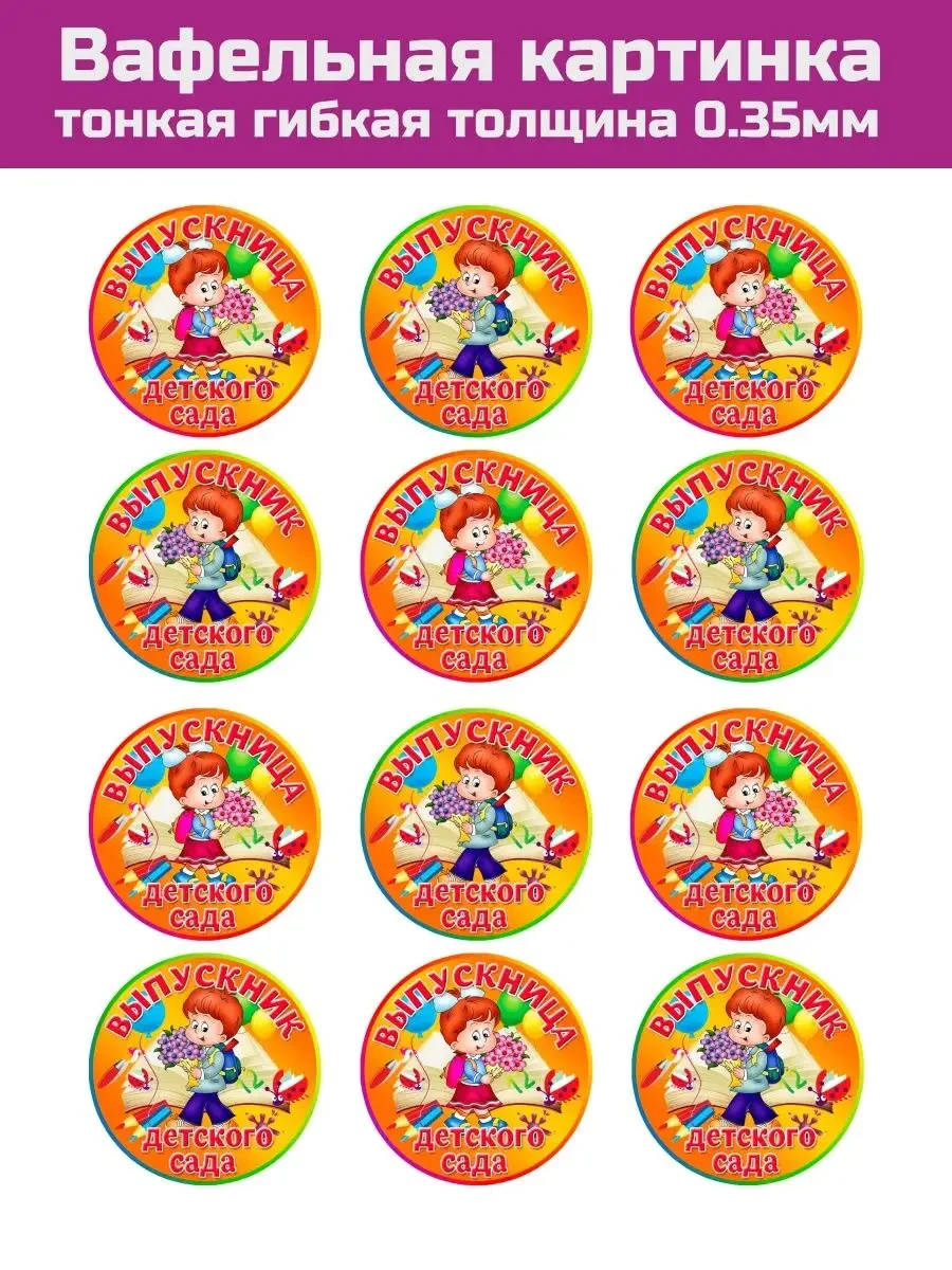 Вафельная печать на тему выпускного детского сада и школы украсит праздничный торт, пряник или капкейк в такой праздничный день для Вашего ребёнка. Все элименты вырезаются ножницами. Съедобная печать яркая, напечатана пищевыми красителями на гибком вафельном листе с толщиной 0.35мм. Рекомендуем укладывать картинку на мастику, предварительно смазать слегка водой, что бы образовался липкий слой или смазать картинку кондитерским нейтральным гелем. Укладывать на крем, в котором содержится минимум жидкости, это такие как, белково-заварной крем, на масляной основе, ганаш или на застывший айсинг. Если картинку уложить на сметанный, сливочный крем, то картинка может размокнуть. Картинки печатаем яркие, в самом высоком разрешении. Вафельная бумага премиум класса. Производитель Германия и Нидерланды. Срок годности картинки 12 месяцев.