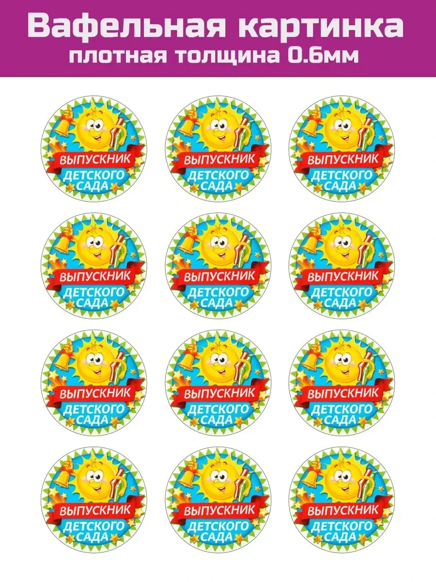 Вафельная печать на тему выпускного детского сада и школы украсит праздничный торт, пряник или капкейк в такой праздничный день для Вашего ребёнка. Все элименты вырезаются ножницами. Съедобная печать яркая, напечатана пищевыми красителями на вафельном листе с толщиной 0.6мм. Рекомендуем укладывать картинку на мастику, предварительно смазать слегка водой, что бы образовался липкий слой или смазать картинку кондитерским нейтральным гелем. Укладывать на крем, в котором содержится минимум жидкости, это такие как, белково-заварной крем, на масляной основе, ганаш или на застывший айсинг. Если картинку уложить на сметанный, сливочный крем, то картинка может размокнуть. Картинки печатаем яркие, в самом высоком разрешении. Вафельная бумага премиум класса. Производитель Германия и Нидерланды. Срок годности картинки 12 месяцев.