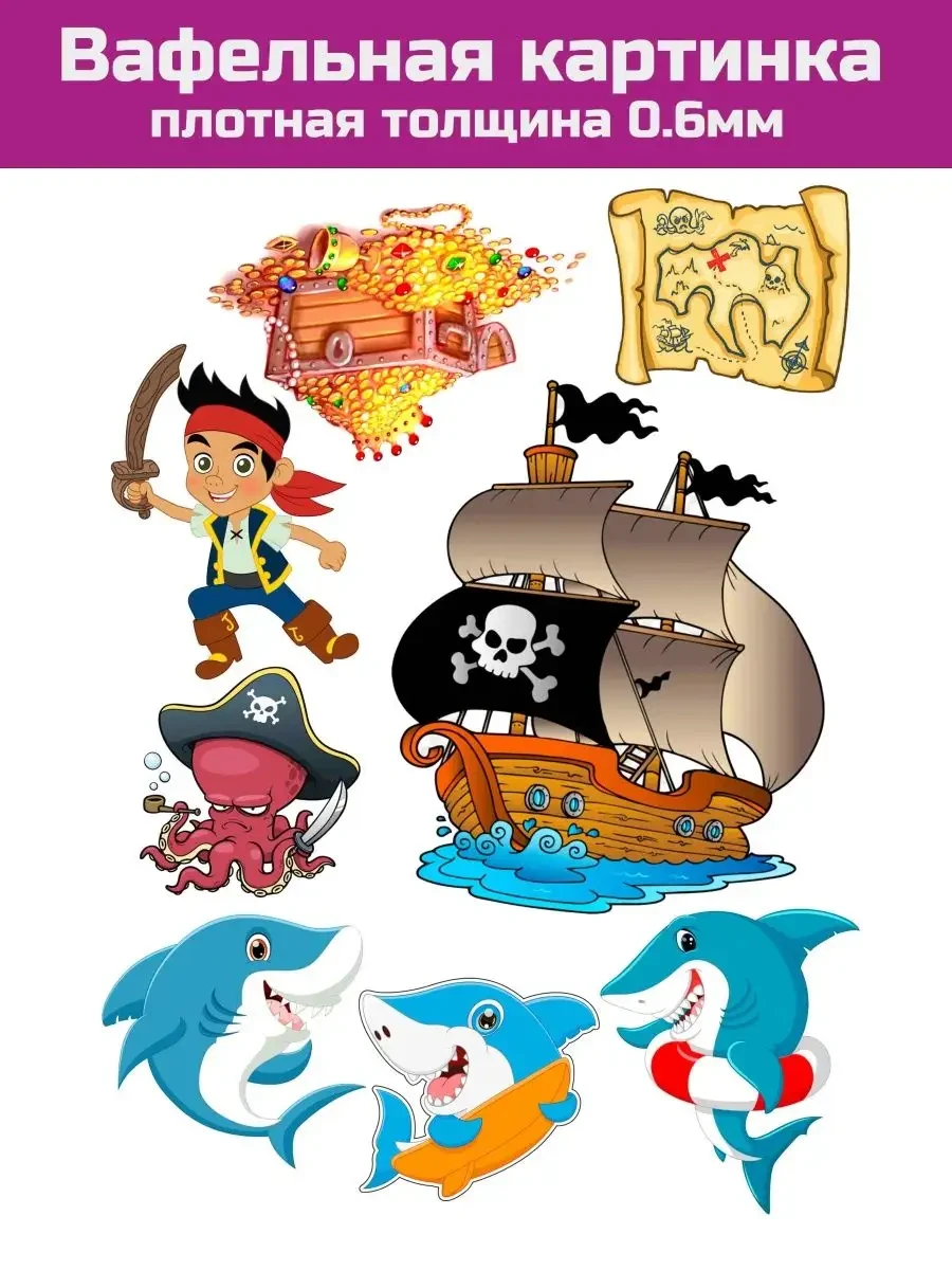 Для того чтобы порадовать ребенка в День Рождения, можно использовать вафельную картинку с изображением пиратов. Такую картинку можно разместить как топер на торте, так и на всю поверхность торта. Картинка сделана из съедобной печати, которая яркая и нанесена пищевыми красителями на вафельный лист толщиной 0.6 мм. Все элементы печати вырезаются ножницами. Для того чтобы правильно разместить картинку на торте, следует уложить ее на мастику, предварительно смазав ее водой, чтобы образовался липкий слой. Также можно использовать кондитерский нейтральный гель. Если картинку уложить на сметанный или сливочный крем, то она может размокнуть. Лучше всего использовать крема, которые содержат минимум жидкости, например, белково-заварной крем, на масляной основе, ганаш или на застывший айсинг. Картинки печатаются в самом высоком разрешении на вафельной бумаге премиум класса, которая производится в Германии и Нидерландах. Срок годности картинки составляет 12 месяцев. Вафельные картинки с изображением пиратов – это отличный способ украсить торт на День Рождения ребенка. Они сделаны из съедобной печати, которая наносится на тонкий и гибкий вафельный лист. Чтобы правильно разместить картинку на торте, следует использовать крема, которые содержат минимум жидкости. Картинки печатаются на вафельной бумаге премиум класса, производимой в Германии и Нидерландах.