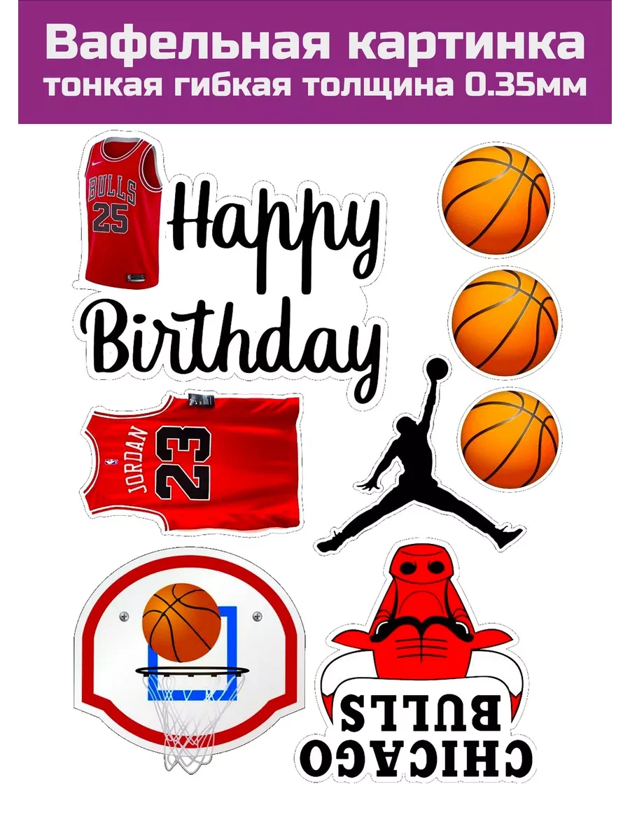 Украсьте праздник на День Рождения яркой вафельной картинкой с изображением известного баскетболиста, например, Майкла Джордана. Эта съедобная печать наносится на тонкий вафельный лист, который можно разместить как топер на торте или на всю поверхность. Толщина вафельного листа составляет 0.35 мм, и все элементы печати вырезаются ножницами.