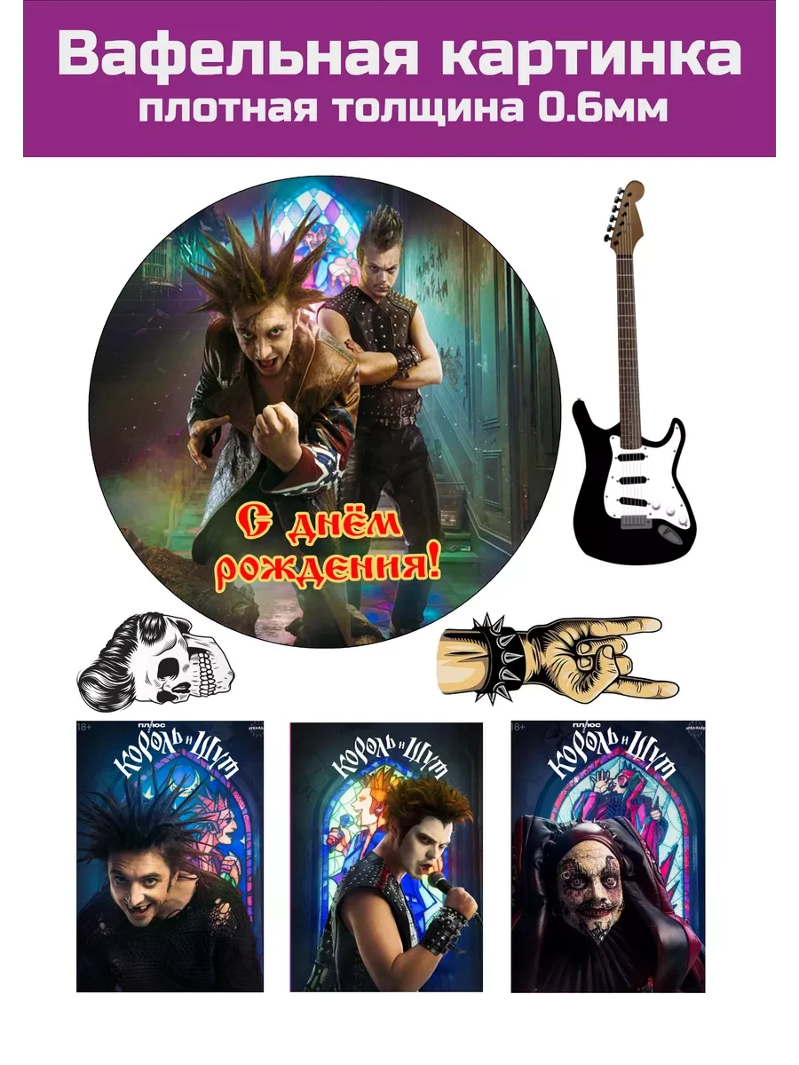 Вафельная картинка легендарной российской рок-группы «Король и Шут» украсит ваши десерты, торты и пряники для фанатов и любителей творчества Михаила Горшенёва (Горшок) на День Рождения или знаменательной вечеринке. Эта вафельная картинка имеет толщину 0,6 мм и напечатана на формате А4. Все элементы можно вырезать ножницами, желательно за день до праздника.