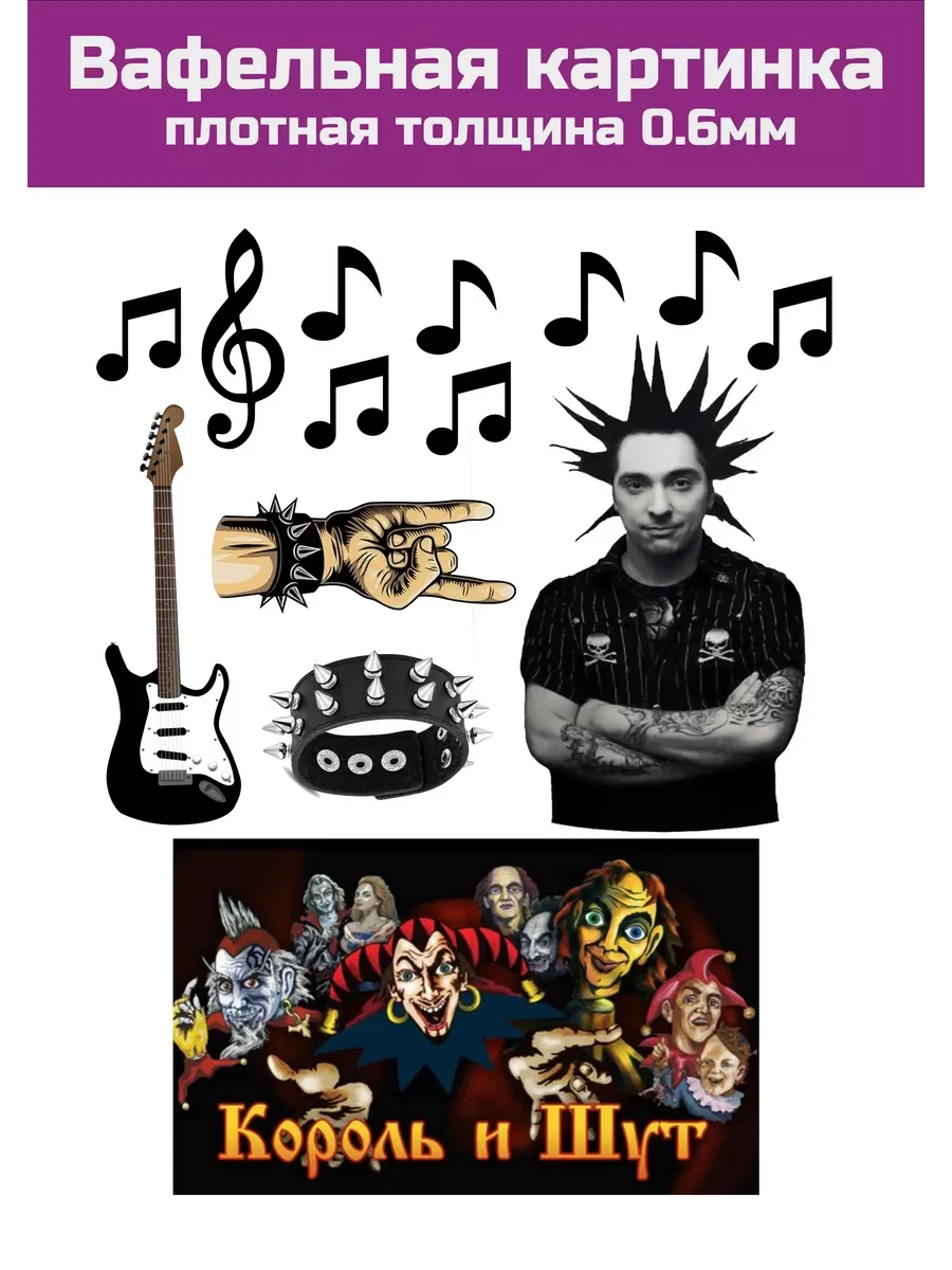 Вафельная картинка легендарной российской рок-группы «Король и Шут» украсит ваши десерты, торты и пряники для фанатов и любителей творчества Михаила Горшенёва (Горшок) на День Рождения или знаменательной вечеринке. Эта вафельная картинка имеет толщину 0,6 мм и напечатана на формате А4. Все элементы можно вырезать ножницами, желательно за день до праздника.